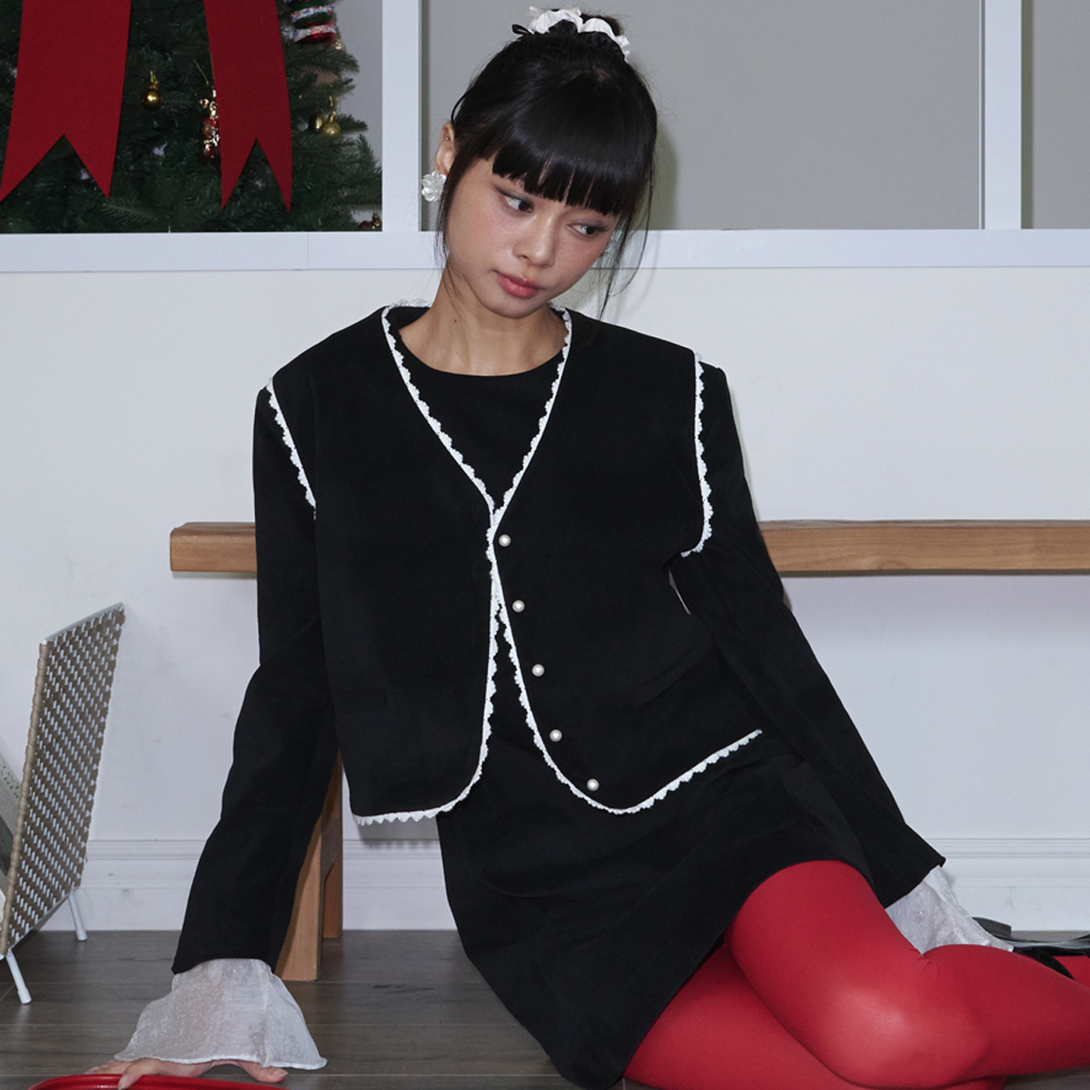 Lace Trimming Velvet Vest_Black