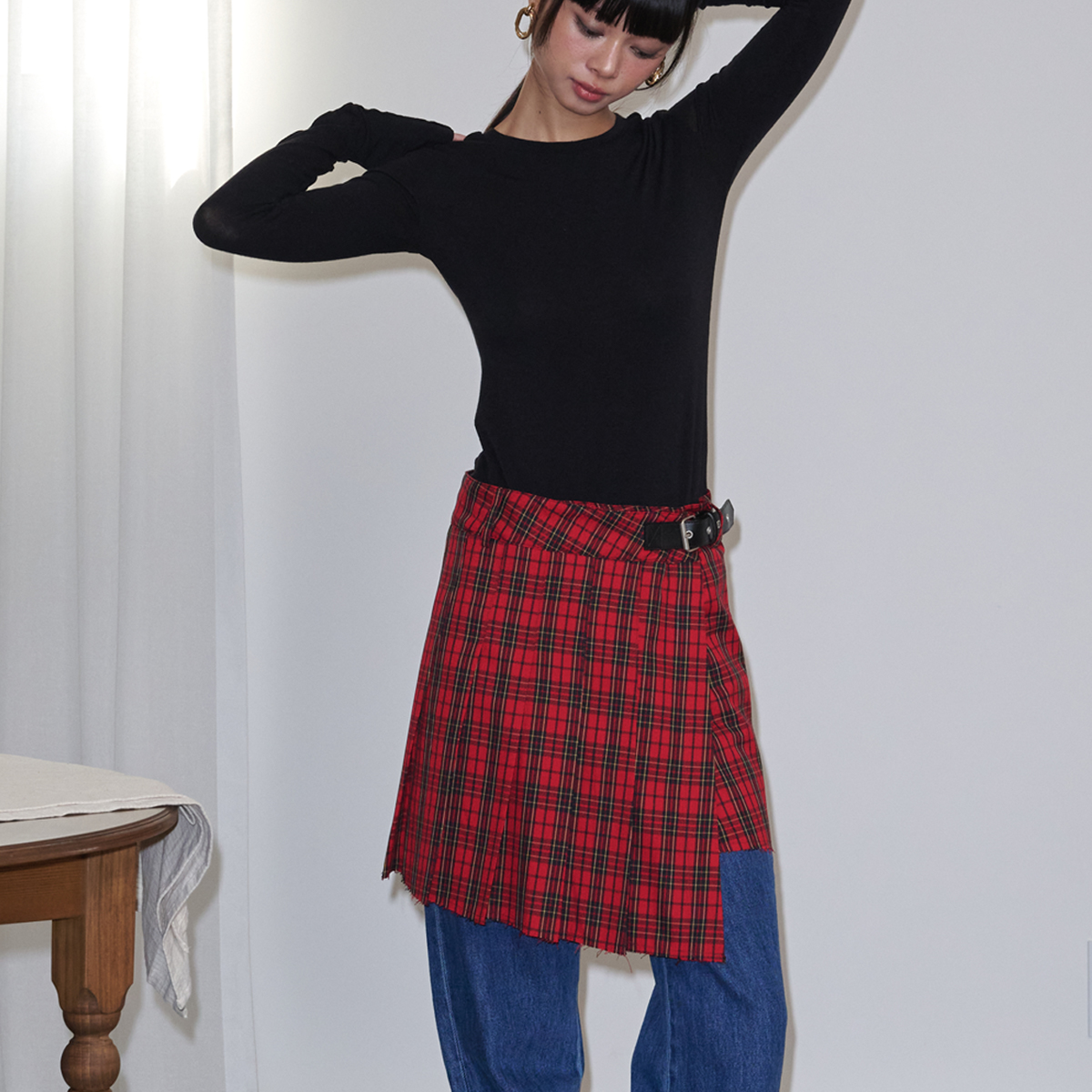 Buckle Pleated Check Wrap Mini Skirt_Red