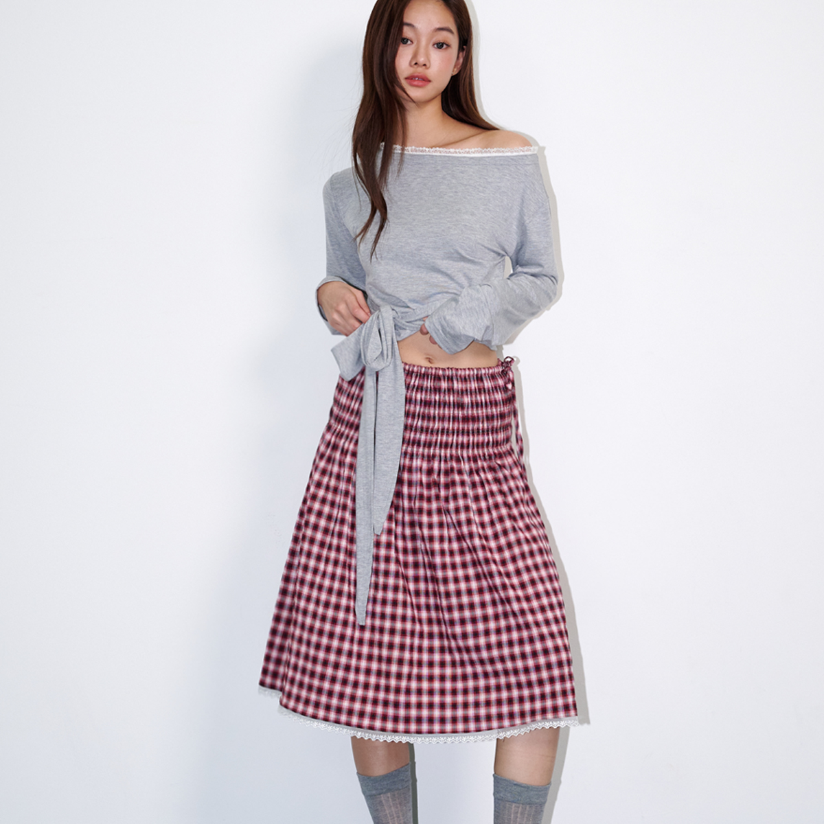 Checked smoke lace pleated skirt Wine
